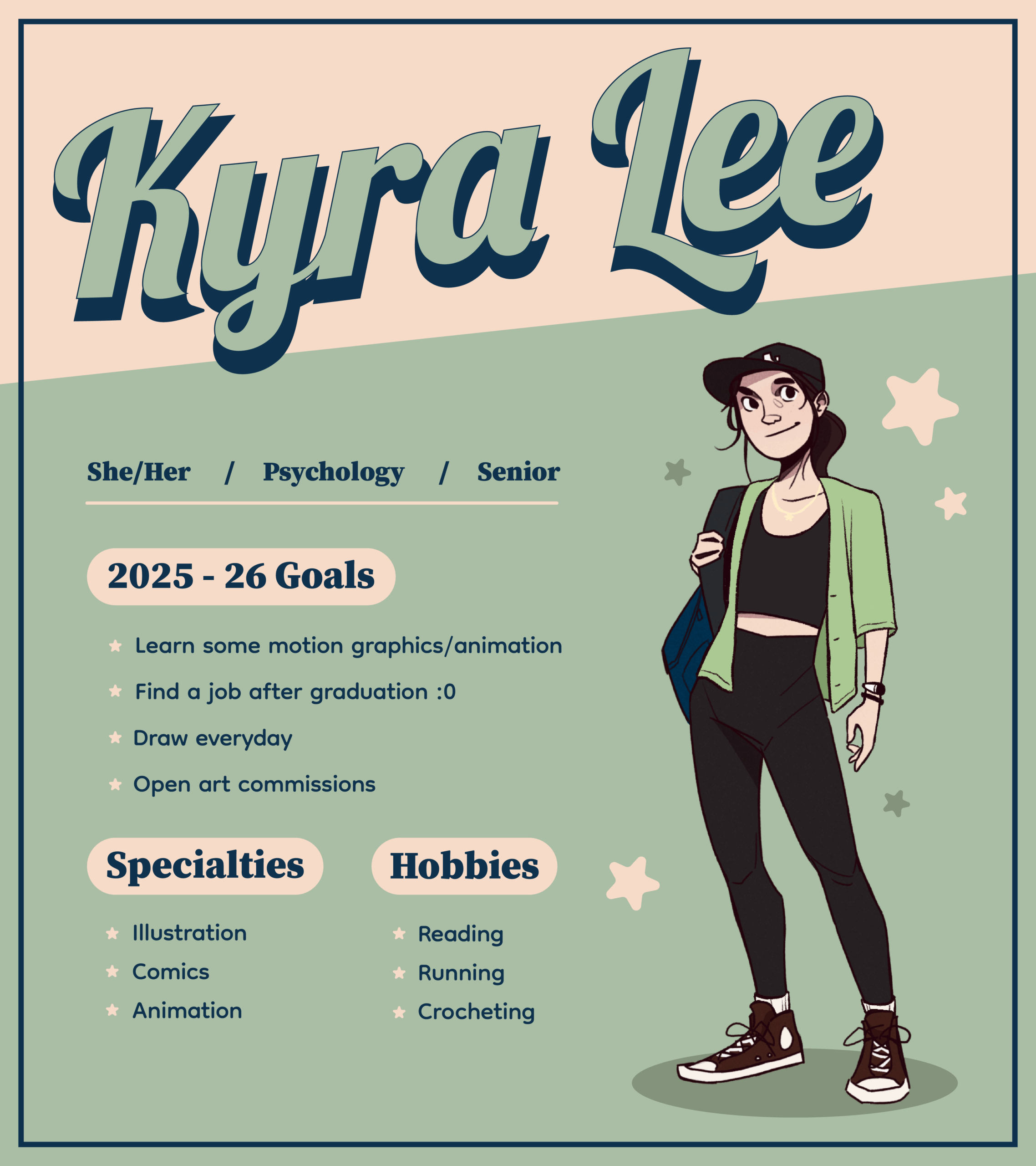 For my first time animating a logo in After Effects I’m pretty happy with this! I like how the star looks like it’s being drawn and the subtle movement of the hand and head. If I were to revise this I would make the logo appear in a more interesting and unified way. Maybe having the head turn around and put some follow through on the hat. I would also like to add movement to the face to give it more personality. Making the eyes blink and the mouth go from neutral to smirking can really bring the logo to life and feel inviting.