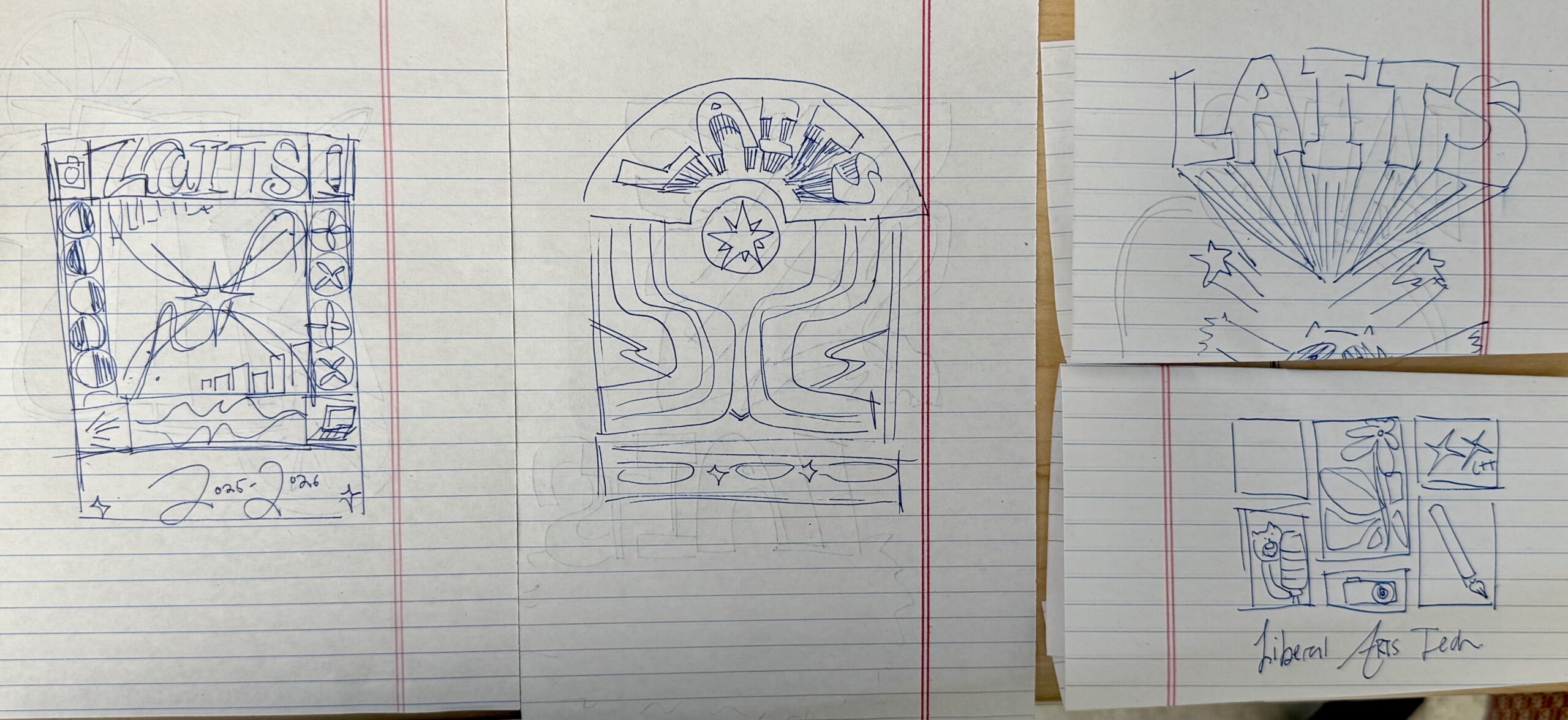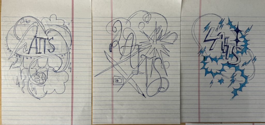 ➜ Design Drafts: I started out by creating a Pinterest board of music posters/y2k designs that inspired me, and then ideated a few sketches for each theme. For the y2k designs, I was inspired by abstract shapes and stars, and dynamic lettering. My music fest designs incorporated more chunky lettering, and a more boxy structure. The y2K sketches are on the left, and music fest sketches are on the right: