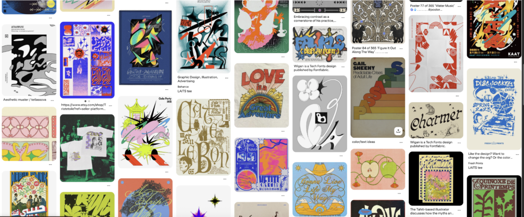My first semi-polished draft was for the y2k/retro vibe, and I took heavy inspiration from the abstract forms in the Pinterest inspo photos. I had fun playing around with different effects on Illustrator and Photoshop for this one: